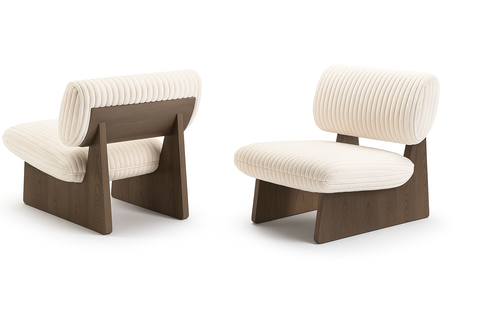 The generously cushioned seat and backrest, wrapped in a sumptuous ribbed fabric, provide both visual interest and exceptional comfort. Its low profile and subtly flared angles make it a striking accent in modern living rooms, reading nooks, or curated lounge spaces.