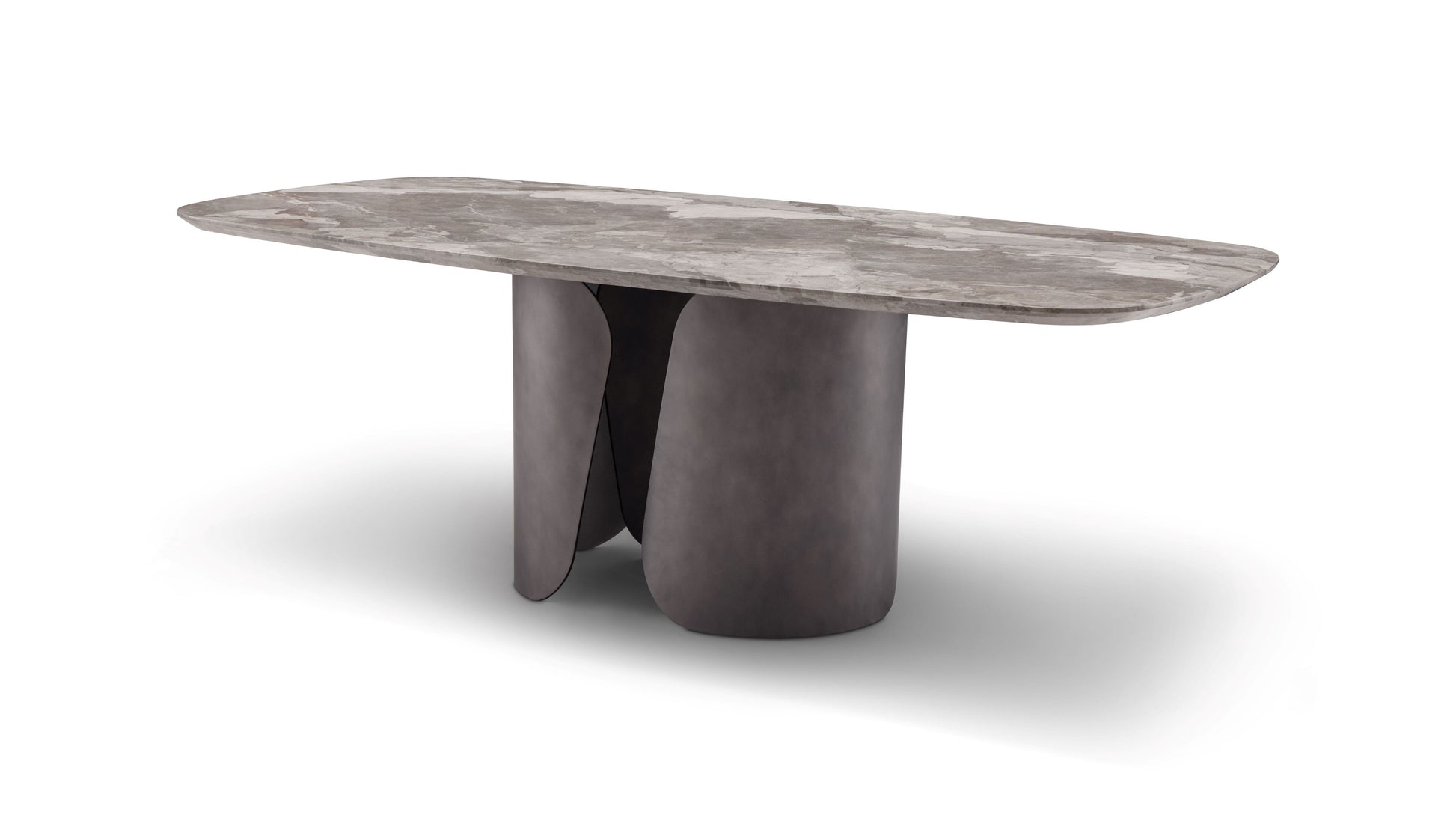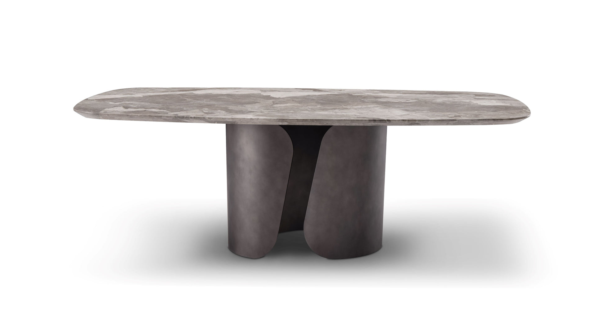 A bold fusion of natural elegance and sculptural form, this designer dining table is a true centerpiece. The tabletop is crafted from exquisite matte brown marble, its bevelled edges lending a refined, tactile finish that enhances the stone’s quiet sophistication.