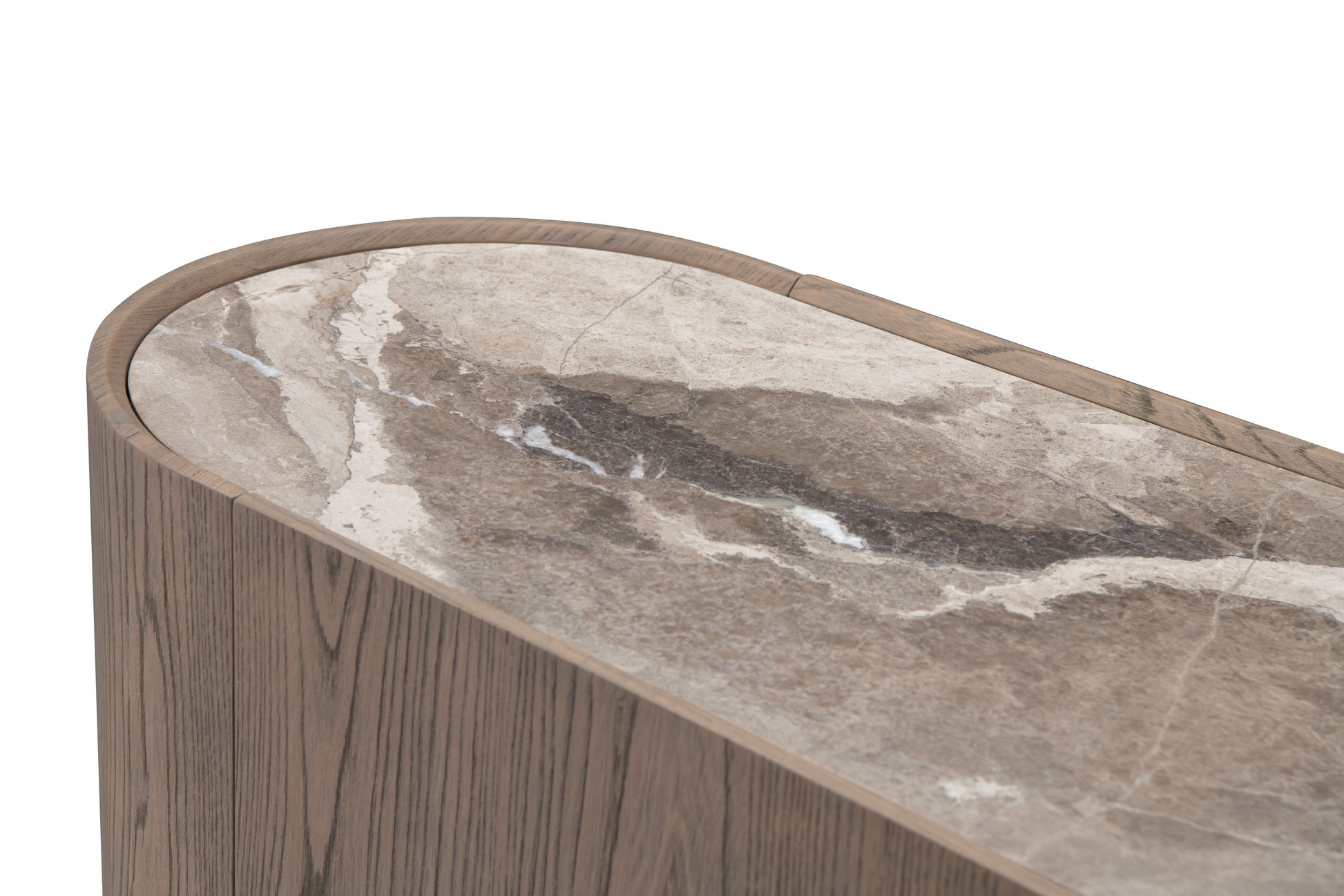 A masterclass in understated luxury, this designer sideboard blends refined materials with sculptural form. The top is crafted from matte, leather-touch maple brown marble—smooth to the touch and rich in natural texture. Below, the body is clad in light grey elm wood with a soft matte finish, offering a quiet elegance that enhances its architectural lines.