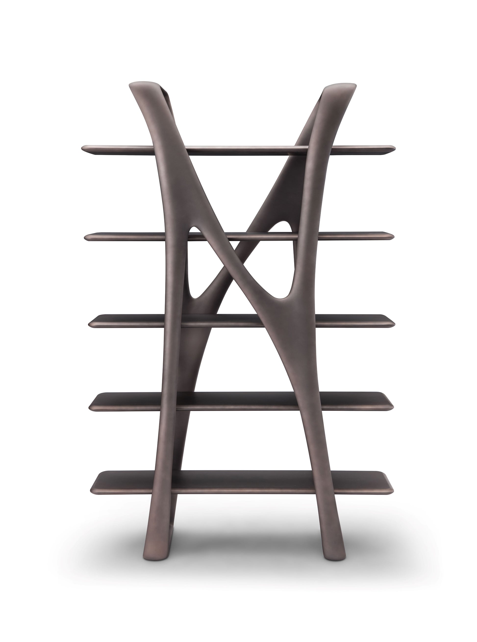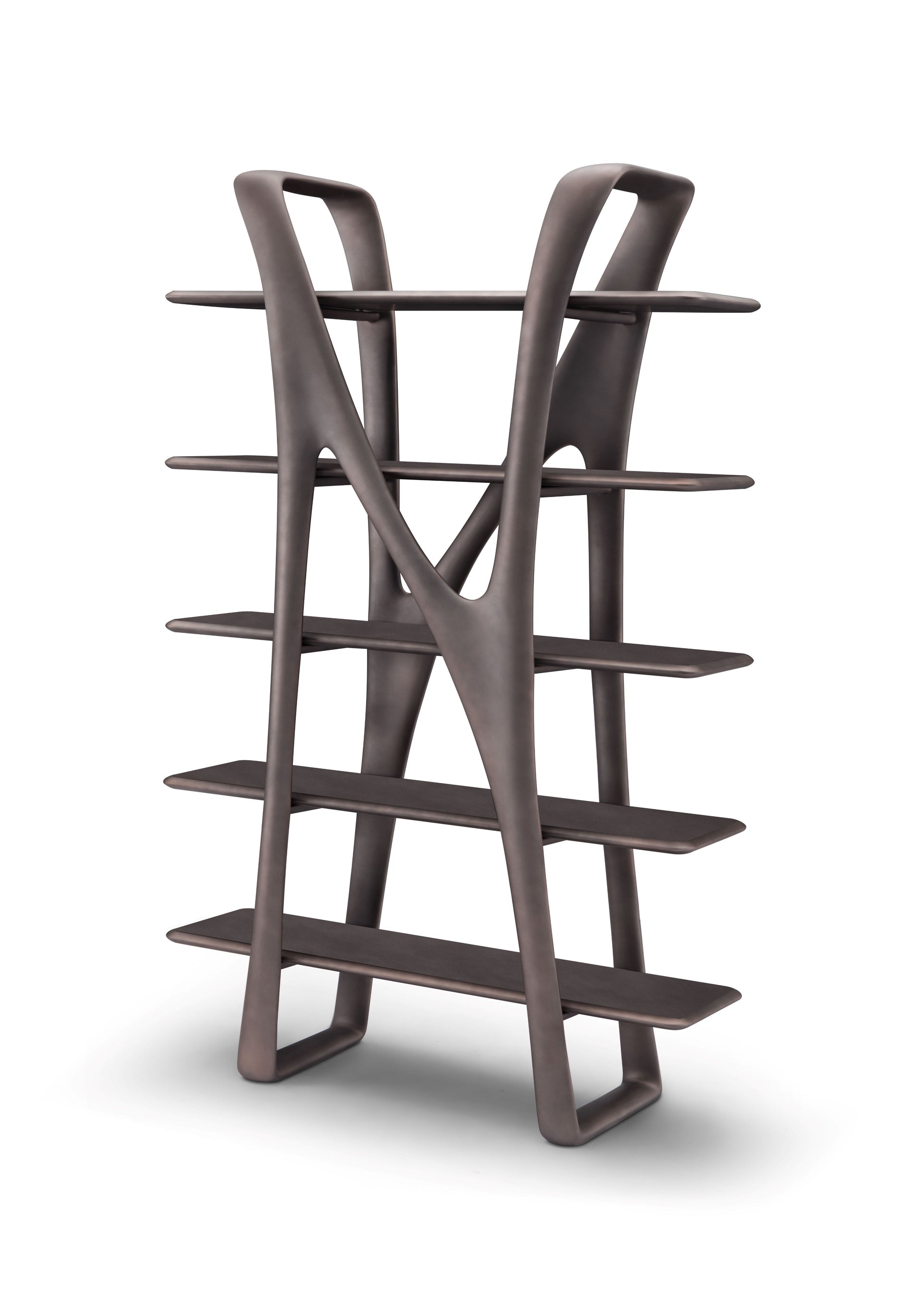 An exquisite balance of utility and artistry, this designer etarge transforms storage into a sculptural statement. Crafted with a luminous brassy metal frame, it features five open shelves that offer both display and function with refined elegance.
