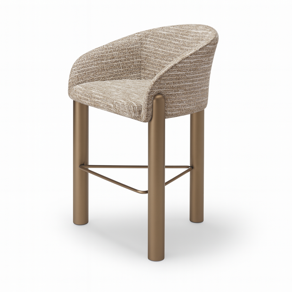 The Enzo Barstool embodies modern elegance with a sculptural presence that transcends function. Its gracefully curved fabric seat and back offer both comfort and refinement, while the bold metal legs in brass metallic lacquer create a striking architectural statement. Exuding sophistication, the Enzo is a versatile piece that elevates both contemporary and classic interiors, making it as much a work of art as it is a seat.