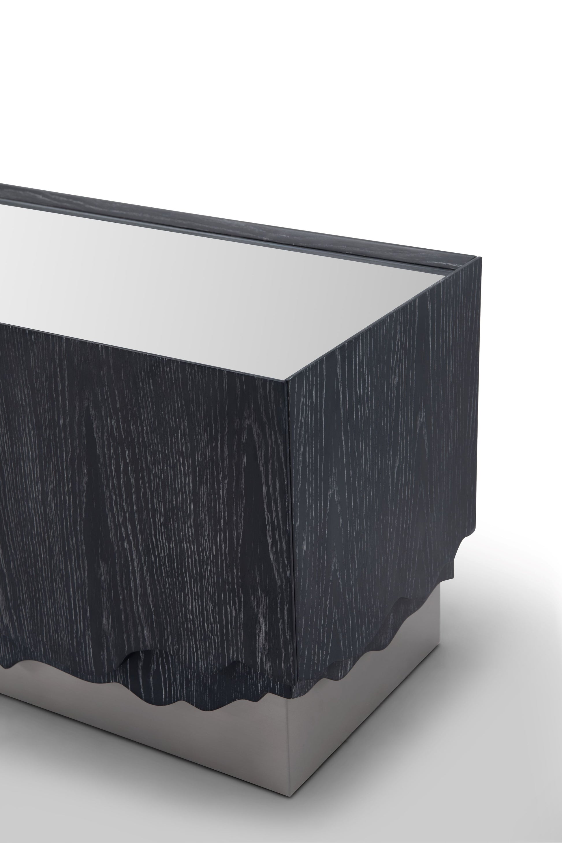 Sculptural and serene, this designer sideboard is a bold homage to nature’s grandeur. The matte black oak wood body is carved with abstract, inverted mountain silhouettes—an artistic interpretation of mountainous landscapes that brings depth and texture to the design.