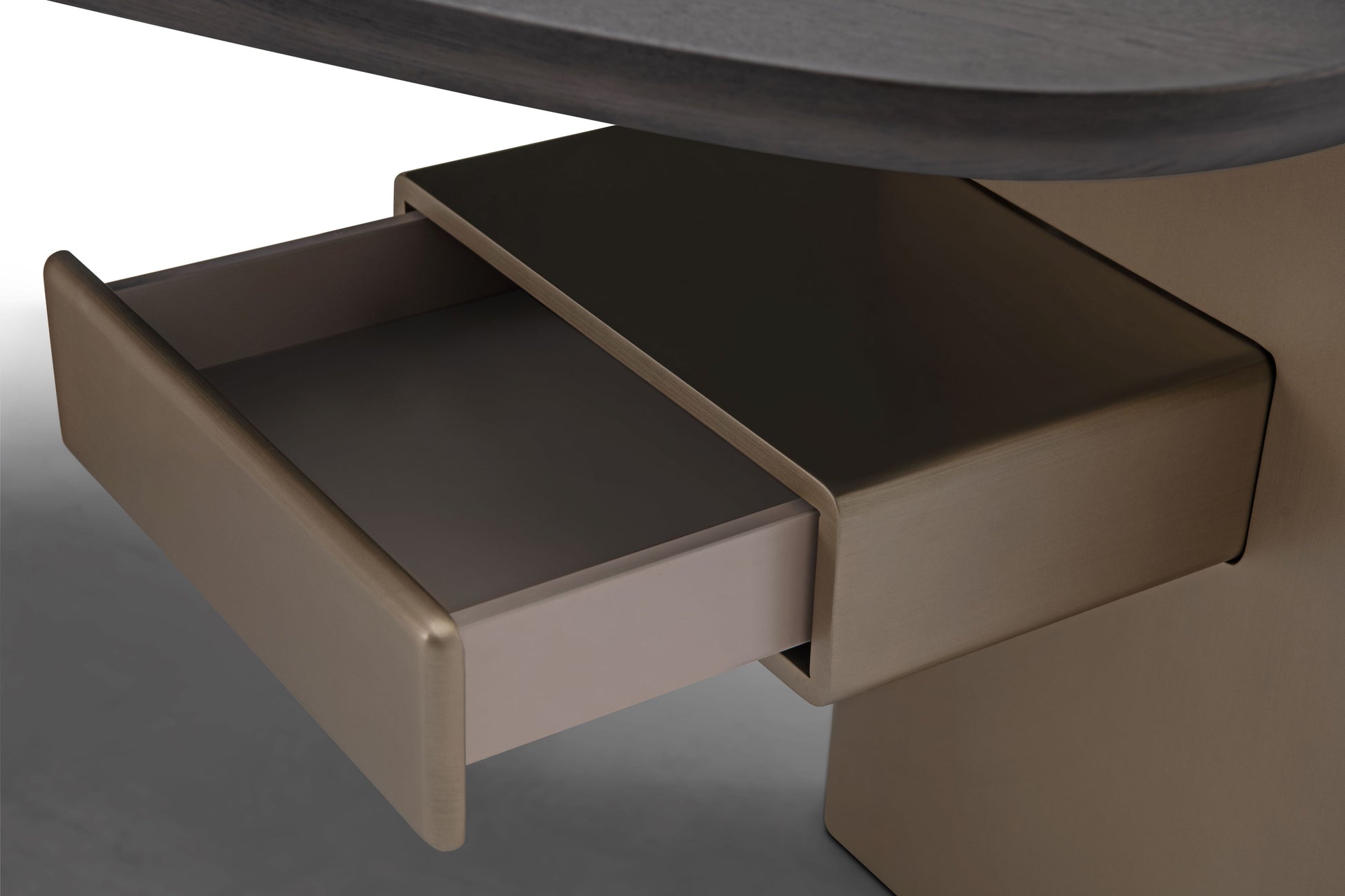 Where the legs meet the tabletop, delicate metallic lines emerge—subtle yet bold artistic expressions that elevate the desk into the realm of collectible design. A discreet drawer, also formed from the same luminous brass, offers both utility and continuity in material palette.