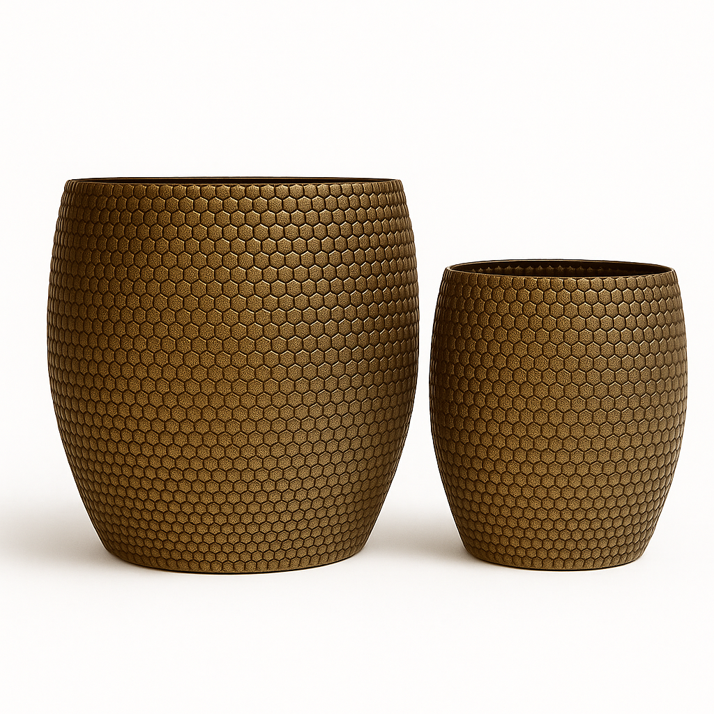Sculptural form meets artisanal texture in the Orion Hammered Basket. Finished in a warm copper-gold tone, its tactile honeycomb pattern casts delicate shadows and highlights, transforming a functional vessel into a piece of design art.