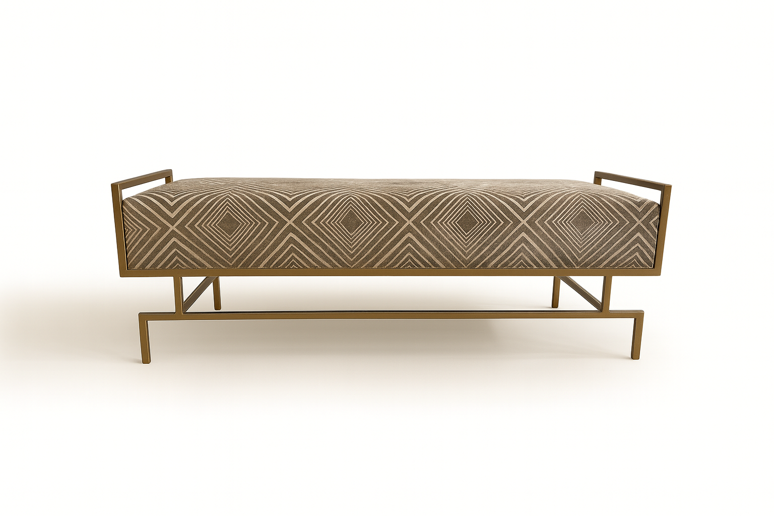 The Torino Ottoman is a statement of refined Italian elegance, seamlessly blending bold design with timeless sophistication. Upholstered in a striking geometric fabric, its intricate pattern evokes a sense of artistry, while the sleek bronze-toned frame adds a sculptural presence. More than an ottoman, it is a piece of functional art — perfect as a luxurious accent in a living room, bedroom, or dressing space.