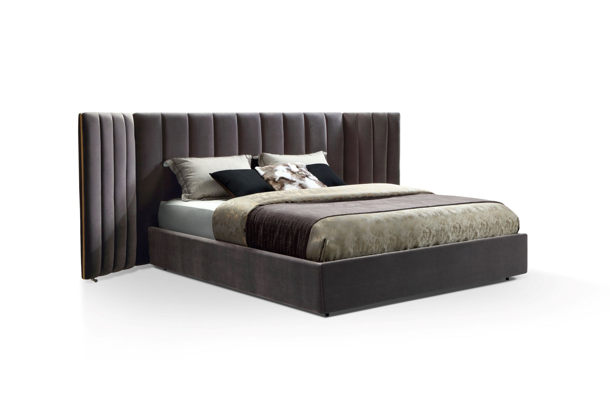The king-size, extra-length base (1800 x 2000 mm) is wrapped in the same luxurious fabric, creating a seamless visual continuity, while brushed brass accents add a subtle yet striking metallic finish, elevating the suite's architectural presence.